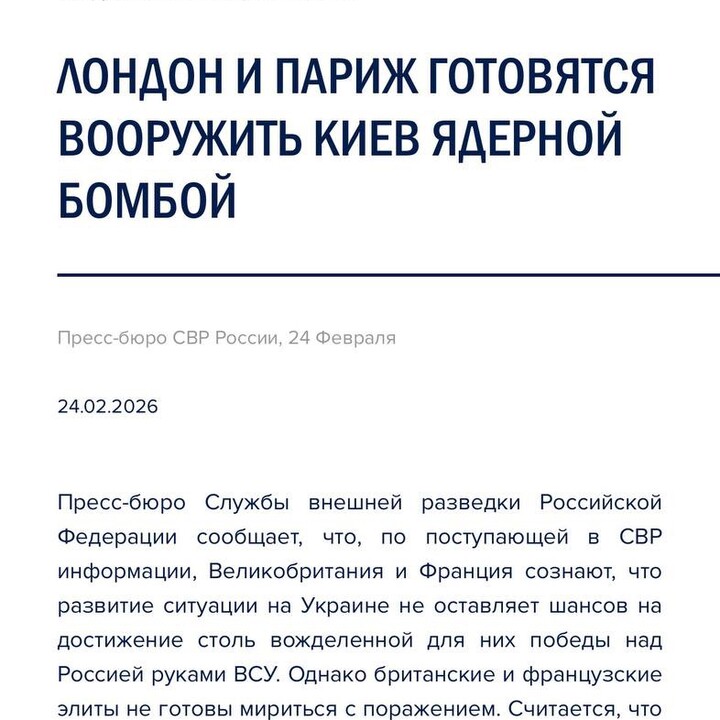 Источник: http://www.svr.gov.ru/smi/2026/02/london-i-parizh-gotovyatsya-vooruzhit-kiev-yadernoy-bomboy.htm